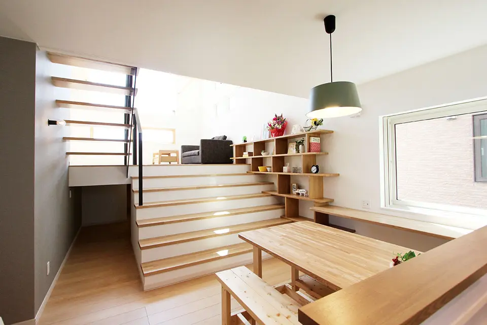 どこにいても家族の気配を感じられます。家事をしながらお子さんの遊んでいる様子を見守ることができるため、安心して過ごせます。また、段差を活用して収納スペースが増やせる点も強みです。