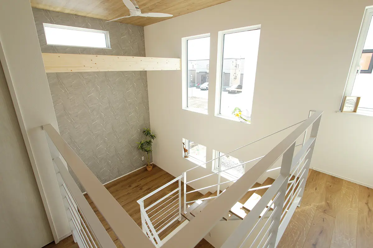 スキップ構造はリズミカルな空間設計で、天井高を高くすることで開放的な空間を演出。スキップフロア(中2階)は書斎や寛ぎのスペースにして家族共有で使ったり、子どものプレイスペースにするなど、様々なプランニングが考えられ、家族の気配を感じられる造りが最大の魅力です。